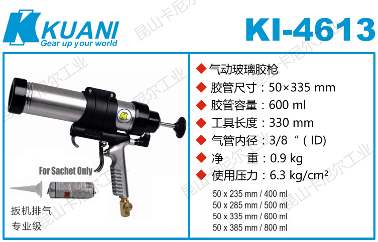 冠亿KI-4613气动玻璃胶枪用途: 气动玻璃胶枪是一种打玻璃胶(或挤玻璃胶)的工具,需要施胶的地方都有可能会用到,广泛用于建筑装饰、门窗、电子电器、汽车及汽车部件、船舶及集装箱等行业。冠亿KI-4613气动玻璃胶枪特点:1.用空气为动力,节能环保还防爆,工作效率高。2.噪音低,不影响周边环境。3.自带调压表,可以通过调整气压来控制出胶量。本机适合软装玻璃胶