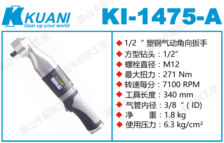 KI-1475-A冠亿弯角气动扳手特点:(塑钢压铸外壳,重量轻、强度更高不变形,提高耐用度)