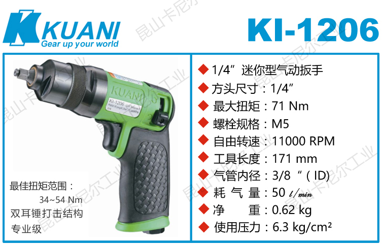 KI-1206冠亿1/4轻型风扳手特点:(塑钢外壳,强度更高不变形,提高耐用度)