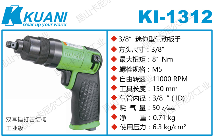 KI-1312冠亿3/8轻型气动扳手特点:(塑钢外壳,强度更高不变形,提高耐用度)