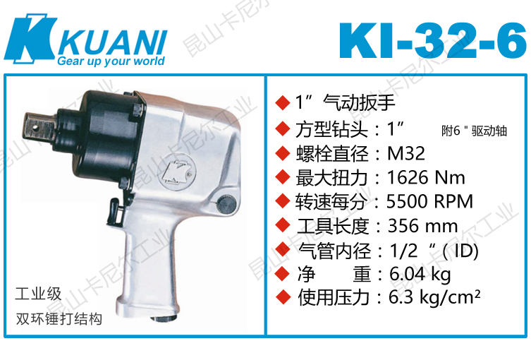 KI-32-6冠亿超大型空气冲击扳手特点:(重力压铸外壳,强度更高不变形,提高耐用度)