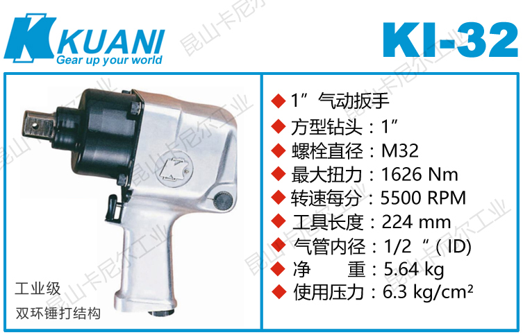 重型气动扳手冠亿KI-32特点:(重力压铸外壳,强度更高不变形,提高耐用度)