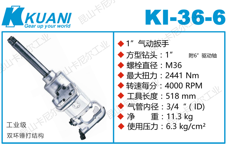 KI-36-6冠亿风炮扳手特点:(重力压铸外壳,强度更高不变形,提高耐用度)