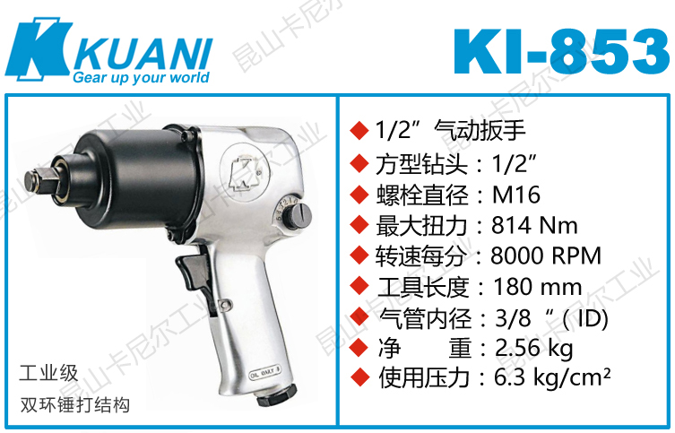 KI-853冠亿气动扳手特点:(重力压铸外壳,强度更高不变形,提高耐用度)