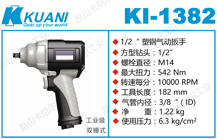 KI-1382冠亿塑钢风动扳手特点:(塑钢外壳,强度更高不变形,提高耐用度)