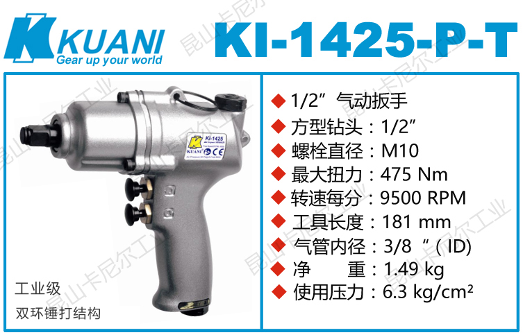 KI-1425-P-T 冠亿1/2气压冲击扳手特点:(重力压铸外壳,强度更高不变形,提高耐用度)