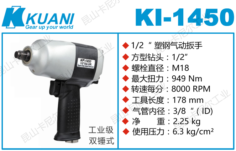 KI-1450冠亿复合气动扳手特点:(重力压铸外壳,强度更高不变形,提高耐用度)