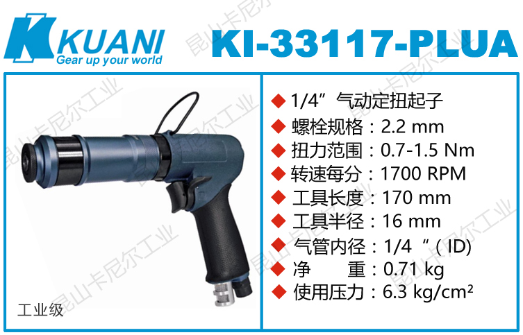 KI-33117-PLUA冠亿枪型定扭气动螺丝刀特点: