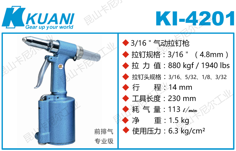 KI-4201冠亿气动拉钉枪用途:1.各种电脑机箱外壳、各种机器机械的机箱外壳、机柜、铝合金门窗等等制造业所需的钣金铆接作业。2.集装箱、车厢、汽车、航空、船舶等等的铆接作业。KI-4201冠亿气动拉钉枪特点:1.拉断能力强。2.故障率低,寿命长,耐用性佳。3.反作用力小,操作灵活,提高效率。4.品种齐全,适合不同规格,不同强度的铆钉。5.人体工学设计,长时间使用不疲劳。