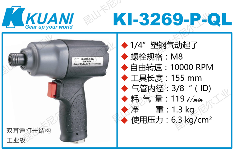 冠亿KI-3269-P-QL塑钢气动起子特点:(重力压铸外壳,强度更高不变形,提高耐用度)